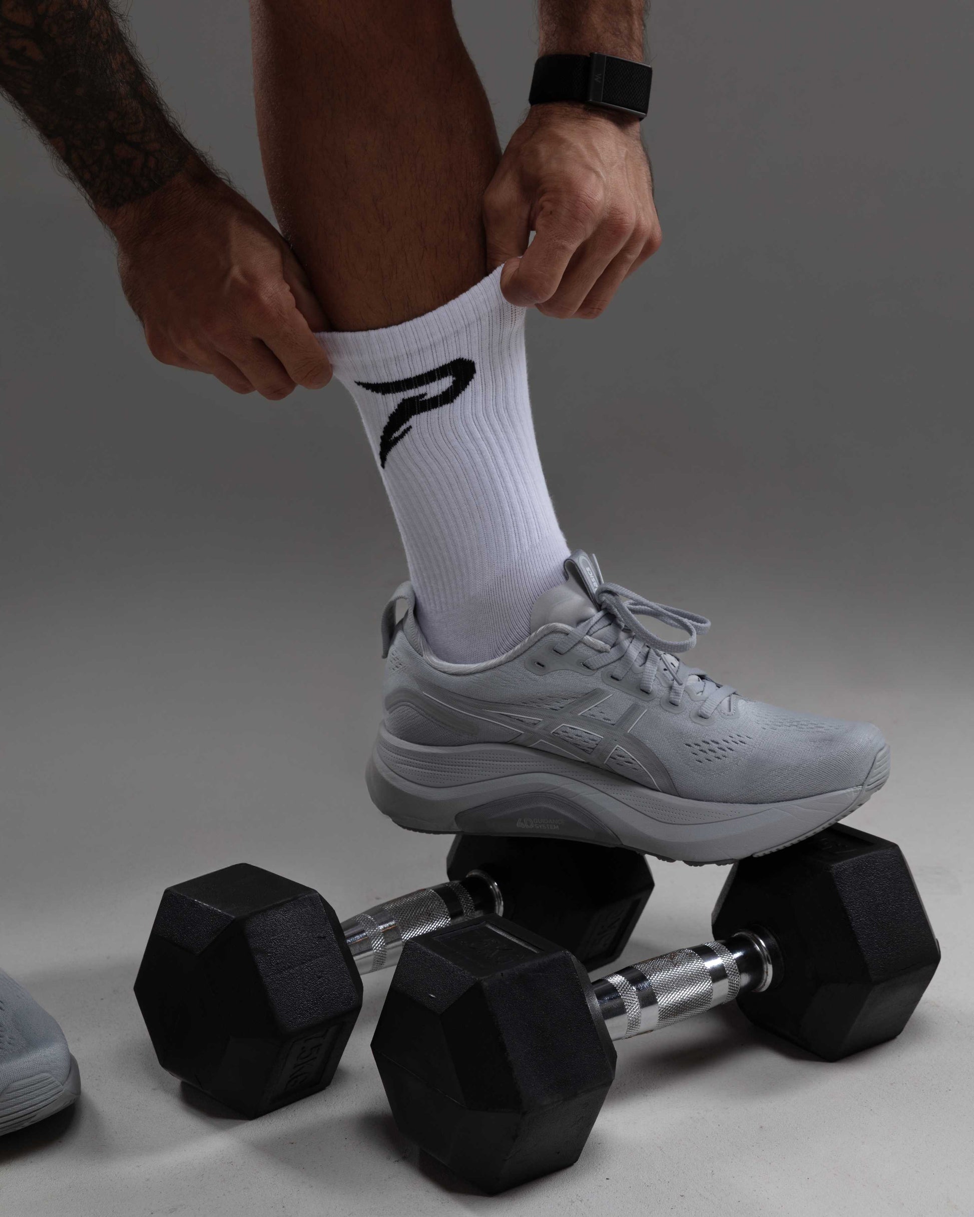 Train longer with the PACE Crew Socks. A soft, breathable cotton blend with targeted cushioning and arch support keeps your feet comfortable in the gym, on runs, and every day. A stay-up ribbed cuff and reinforced heel & toe add durability, finished with the signature PACE logo.